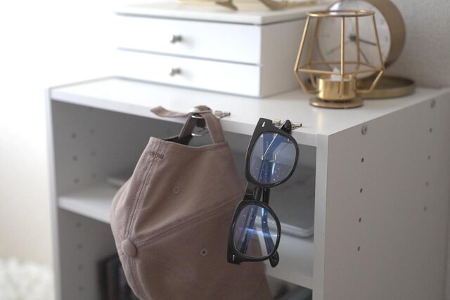 大きめのダブルクリップならカラーボックスなどの棚板も簡単に挟めるので、かけたい場所にフックを作ることができて便利です。