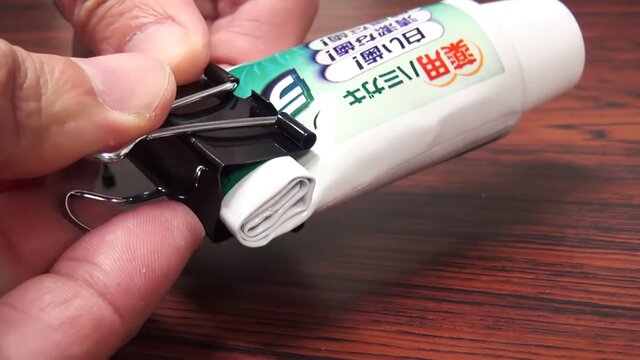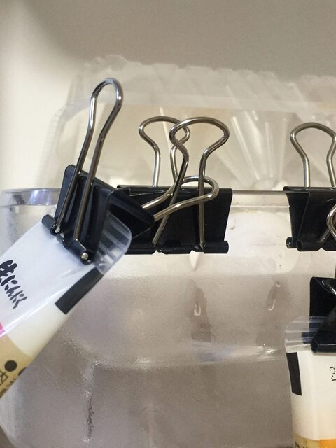 冷蔵庫のポケット部分にダブルクリップを設置し、チューブにもクリップを付けたら吊るすだけ。