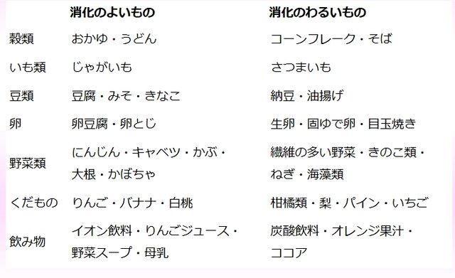特に、脂っこい料理や糖分を多く含む料理、お菓子、香辛料の多い料理や食物繊維を多く含む食事(ジュース、アイスクリーム、牛乳、ヨーグルト、肉、脂肪分の多い魚、ごぼう、海藻など)は胃腸に負担をかけるので、控えた方がベストです。